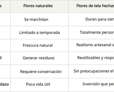 Tabla comparativa entre flores naturales y flores de tela para ramo de novia